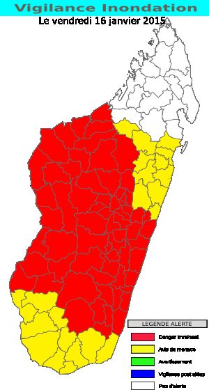Le cyclone Chedza qui s’est formé dans le canal de Mozambique est entré à Belo sur Tsiribihina hier 16 janvier 2015 vers 14 heures. Il se trouvait dans le district d’Ambalavao à 6 h du matin ce 17 janvier et se dirige vers Ikongo. Les météorologues prévoient sa sortie dans l’océan indien par Farafangana dans la journée. Rivo Randrianarison, technicien au service de la météorologie d’Antananarivo, note que les alertes lancées depuis quelques jours sont encore valables et appelle à la vigilance de tout et chacun. Alerte rouge pour toutes les régions de Menabe, Melaky, Amoron’imania, Boeny, Analamanga. Alerte jaune et verte pour les autres. Seule la région Nord de l’île, notamment Diana, est épargnée.