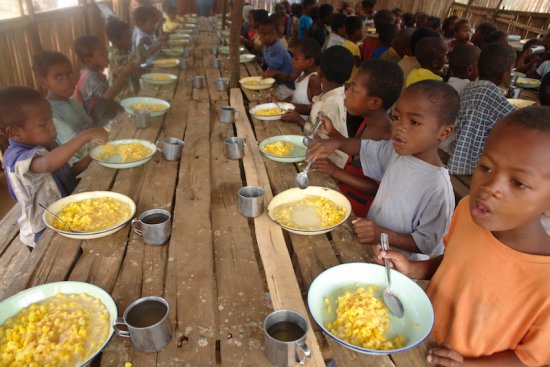 Le programme de cantines scolaires fournit un repas quotidien à plus de 220 000 élèves, cuisinières et enseignants dans près de 1 200 écoles primaires des régions Anôsy, Androy et Atsimo Andrefana, au sud de l’île. Ce programme est rendu possible grâce à l’appui financier de plusieurs bailleurs y compris le Canada, la France, la Norvège, la Banque Mondiale et l’Union Européenne. Les cantines scolaires couvrent actuellement 43% des enfants en âge d’être scolarisés dans ces zones.