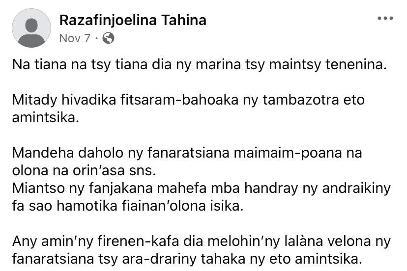On ne peut qu’approuver la décision salutaire et courageuse prise par Tahiana « Jay Tax » Rasolojaona de porter plainte contre « l’influenceuse » Syntia, qui l’avait accusé de cacher Naina Andriantsitohaina chez lui. Courageuse, car devant les outrances croissantes de certains internautes, beaucoup choisissent de se taire par peur d’envenimer les choses. Salutaire, car il es temps que les balises soient rappelées à ceux qui confondent liberté d’expression et droit de dire n’importe quoi. Saluons dans la foulée le coup de gueule de Tahina Razafinjoelina sur Facebook contre les dérives actuelles sur les réseaux sociaux (photo).