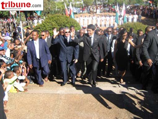 Contrairement à Ambohijatovo, le calme a régné au Mausolée dans l’après-midi de ce lundi 29 mars 2010. Pour la cérémonie de dépôt des gerbes, le président de la Haute Autorité de la Transition (HAT), Andry Rajoelina, accompagné de son épouse, est arrivé sur le lieu aux environs de 15 heures. Le Premier ministre, le colonel Albert Camille Vital quant à lui est arrivé 15 minutes auparavant, après que tous les ministres ont pu rejoindre les places qui leur sont réservées. Une heure avant la cérémonie, la route reliant Ampandrianomby et le Mausolée a été interdite aux transports en commun. Les voitures des particuliers par contre ont pu circuler librement. Il n’y a pas eu de grand bain de foule avant et après la cérémonie. Le patron d’Ambohitsorohitra n’a pris que quelques poignées de main, malgré le désir de la foule de lui serrer la main avant et après la cérémonie.